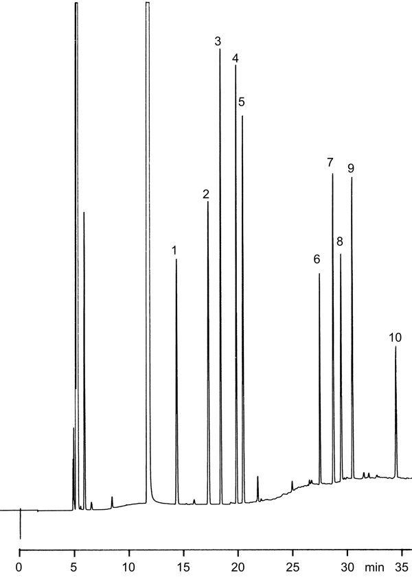 Legend: Peaks: 1. alpha -Pinene; 2. beta-Pinene; 3. 3-Carene; 4. Limonene; 5. Eucalyptol (Cineole); 6. Camphor; 7. Linalool; 8. Bornyl acetate; 9. Menthol; 10. Carvone