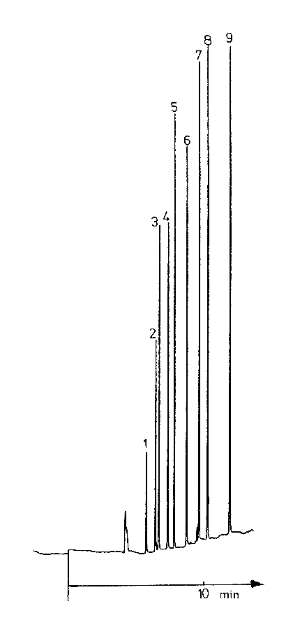 Injection volume: 1 µl Carrier gas: 0.4 bar N2 Split: 1 : 50 Temperature: 150 °C (5 min iso); 8 C/min to 200 C