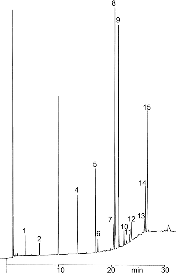 Legend: Peaks: Fatty acid methyl esters (FAME): 1. C8:0; 2. C10:0; 3. C12:0; 4. C14:0; 5. C16:0; 6. C16:1; 7. C18:0; 8. C18:1; 9. C18:2; 10. C18:3; 11. C20:0; 12. C20:1; 13. C20:5; 14. C22:0; 15. C22:1