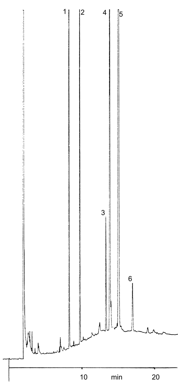 Legend: Peaks: 1. C15:0; 2. C16:0; 3. C18:0; 4. C18:1; 5. C18:2; 6. C18:3