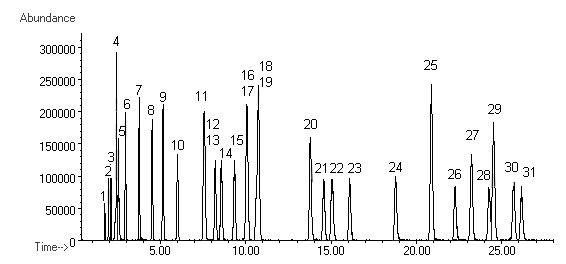 Oventemp. : 40 C, 8 min iso, 1.5 C/min to 70 C, 4 C/min to 180 C